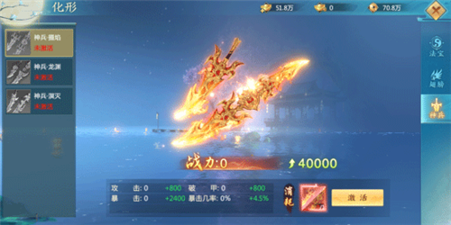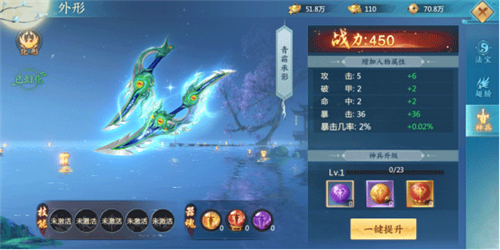 获得海量暴击属性;激活神兵外形可按百分比提升暴击属性,并拥有专属外观展示。