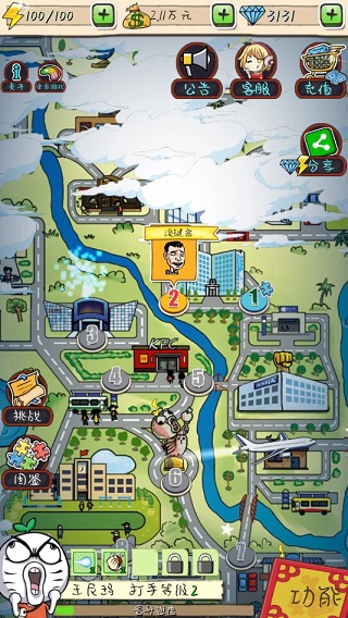 游戏的整体美术风格完全沿用了暴走漫画的夸张路线,剧情设计也紧密贴合暴漫的搞笑内核,将那些令人捧腹的日常桥段植入到游戏关卡之中。玩家需要在这个荒诞的背景设定下,与各类角色展开对战。这种将网络流行文化转化为游戏主题的思路颇具新意。此外,游戏的背景音乐与音效也搭配得当,营造了不错的氛围。然而,游戏的缺陷同样突出:其核心战斗模式较为单调,容易让人感到乏味。尤其值得注意的是,防御机制仅能减少一半所受伤害,且在成功防御后无法立即进行反击,这使得防御行为在很大程度上陷入被动,战略价值大打折扣。