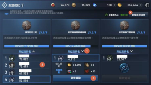 位置1:可查看自身与贡献度排名前三的成员信息。点击箭头可展开如位置2所示详情;点击位置3可查看该成就的全部奖励内容;点击位置4则进入完整的成就总览列表。