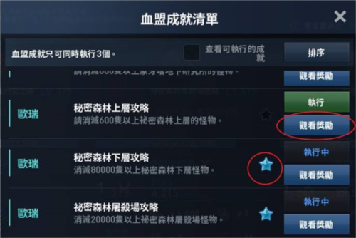 A. 点击血盟成就按钮进入界面,选择查看成就列表: