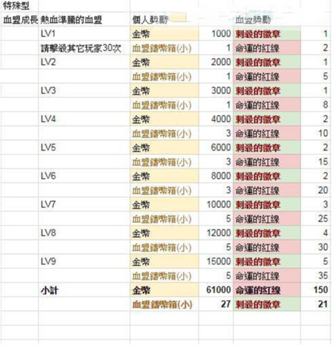 a. 需要在线并实际获取道具,但无需捐赠:财富积累(获取金币量)大于热血新人(获取血盟贡献证数量);
