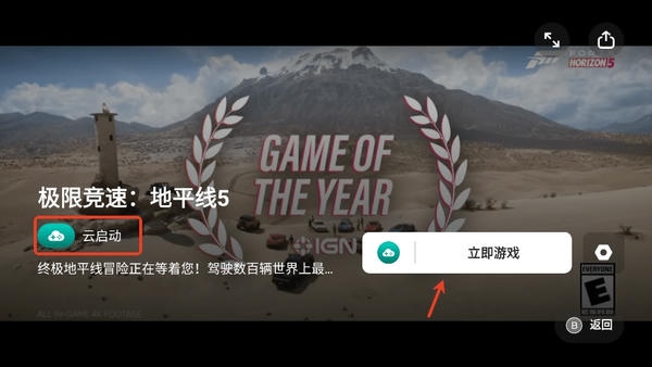7、在首页挑选云启动游戏,比如极限竞速:地平线5,点选立即游戏。