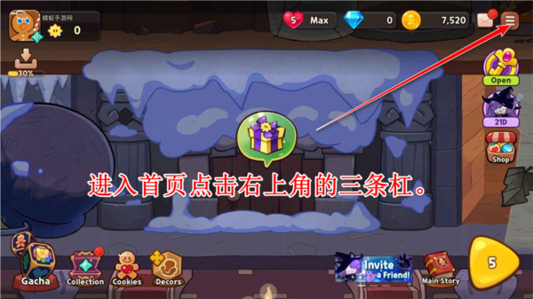1、首先在游戏首页找到并点击右上角的三条横线图标。