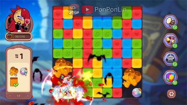 可供上阵搭配的饼干角色会逐渐增多;应根据关卡的具体情况,灵活选择一位特殊饼干登场;例如,吸血鬼饼干能够直接消除固定五格范围内的障碍物。