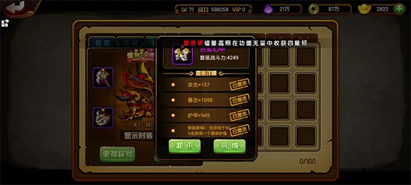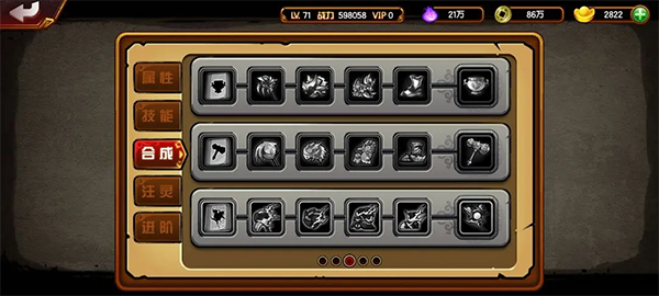 宝石合成成功率:一级100%,二级70%,三级50%;前期凑齐一套三级宝石即可;合成在八卦炉进行。