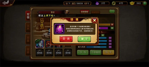 此为全洗功能,注意宠物二阶后建议改用单洗,每次消耗40万金币。