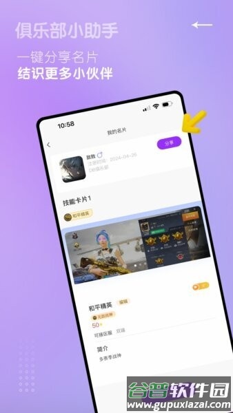 这款App采用了简洁的紫色界面,设计上注重易用性,支持一键分享名片和技能卡片,还能自动生成数据报告。俱乐部可以通过它建立独立店铺,用扫码或链接方式轻松引流,把品牌影响力扩展到更多玩家群体中。