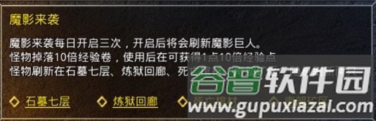 每次活动开始后,可通过NPC传送至指定地图,每张地图刷新两只魔影巨人首领。首领掉落十分丰厚,除固定掉落十倍经验点外,还有机会获得高级装备,是快速积累财富的途径。