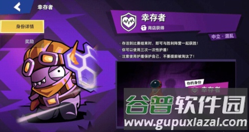 4、幸存者:存活至场上总人数剩余三人时获胜,配有一次性的护盾技能,可抵挡一次伤害,相对容易达成胜利条件;