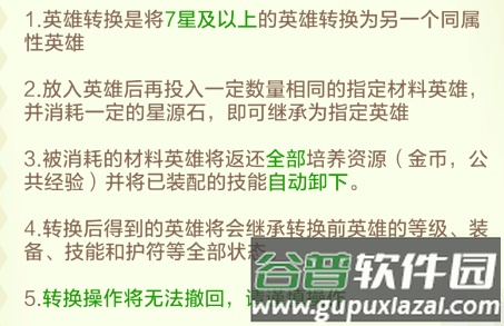 转换入口位于重生功能旁边。该功能允许玩家将七星及以上品质的英雄,转换为同属性的其他指定英雄。转换需要消耗指定的材料英雄以及星源石,操作不可逆转,执行前需慎重考虑。