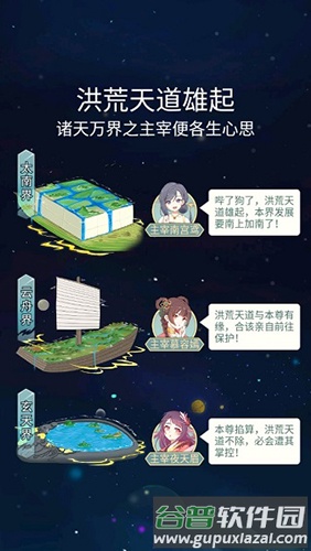 游戏设定:玩家扮演世界统治者,即洪荒天道,目标为征战其他世界,并将其中的大能转化为自身鼎炉。