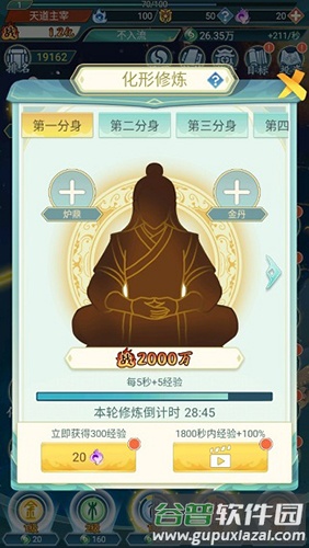 2、修炼多个分身,通过添加炉鼎与金丹有效提升升级效率;