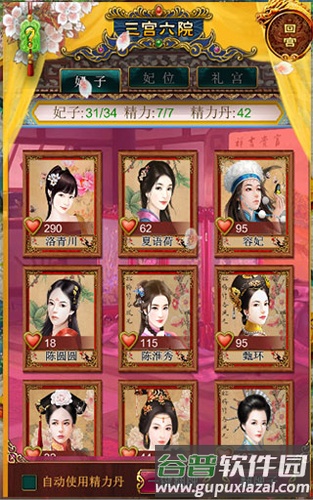 2、三宫六院:游戏现有33位妃子,初始仅有一位;其余妃子可通过跑马、寻宝等活动获得。