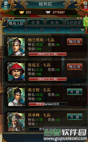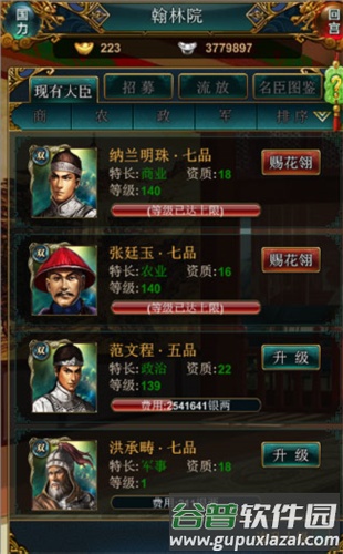 1、臣子培养在翰林院进行。游戏初期提供四位大臣,均从一级开始升级。