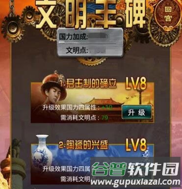 13、文明丰碑系统:通过征服世界也可提升国力。推进征服世界进度可解锁文明丰碑(位于“征服世界”界面左上角)以增加国力;当20个丰碑全部解锁后,可消耗文明点进行升级,获得进一步国力加成。