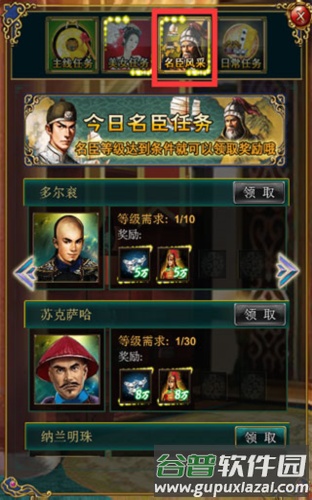 5、名臣风采:该任务与大臣等级相关。每日会更新四位大臣的任务,当指定大臣等级达到要求时,便可领取奖励。