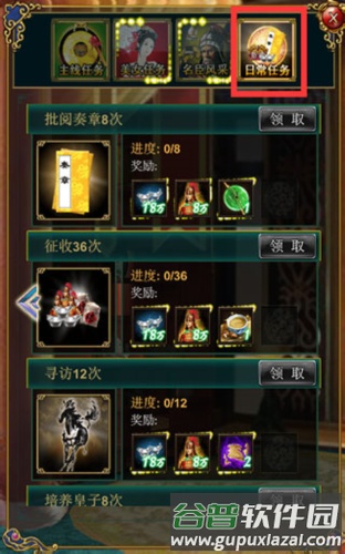 4、美女任务:该任务与后宫妃子亲密度相关。每日会更新四位妃子的任务,当与指定妃子亲密度达到要求时,即可领取奖励。
