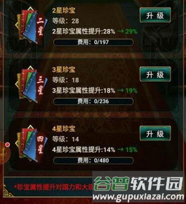 8、珍宝加成即向大臣赏赐书籍。此外,可在养心殿的“珍宝升级”中消耗名望点提升珍宝效果,从而增加赏书获得的属性与国力。