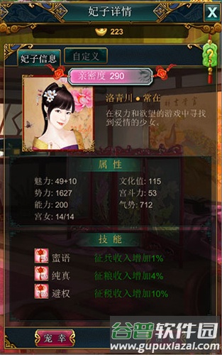 3、每位妃子属性不同,需提升亲密度来解锁。可通过赏赐、跑马等方式提高亲密度。
