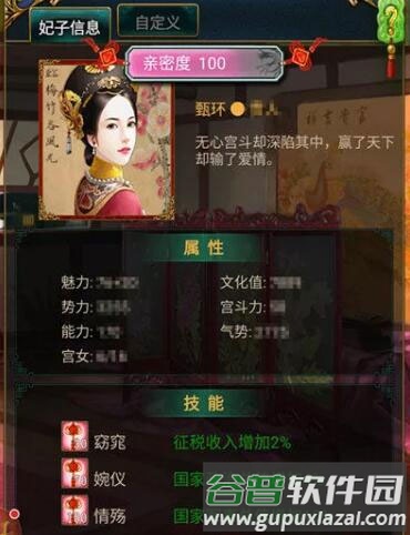 (2)妃子技能对国力提升至关重要。许多妃子技能可增加国家四维属性、提升珍宝效果或后宫势力;例如甄环,亲密度达70时国家政治总值增加4%,达100时国家军事总值增加4%。