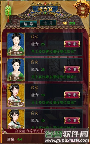 5、储秀宫:此处为宫女培训场所,分为选秀与培养两个板块。需先选秀,后进行培养。宫女分为百里、千里、万里三个等级,培养时间与能力加成对应;培养时间长短为百里>千里>万里。