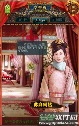 6、交泰殿:妃子在此处理宫务。每日每个殿可领取三次任务,初期仅开放正殿。每完成一项宫务可获得相应后宫势力;宫女数量越多、能力越高,妃子获得的势力也越多。