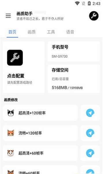 用户通过这款软件可以自主调整游戏画质档位,将游戏运行帧率拉满到120帧,同时能保障游戏全程稳定运行不会掉帧;软件操作逻辑没有任何上手门槛,刚接触的用户也能轻松完成操作,帮助玩家提升操作流畅度,拿到更好的对局成绩;支持自定义设置多种画面风格,调整适配自己设备的最佳屏幕分辨率,界面设计清爽简洁,功能分类清晰,用户可以根据自身需求调整各项参数。